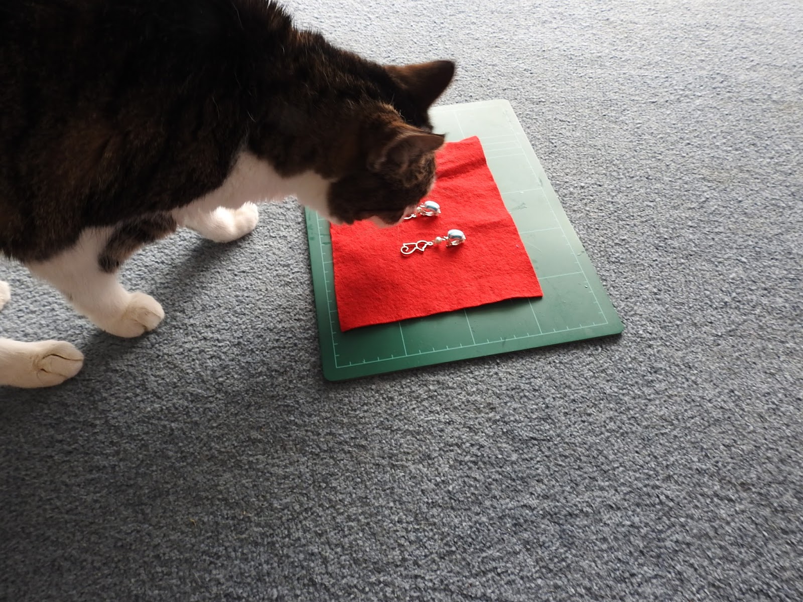 The button is glued on the clip. Wired cat charm and silver round bead are connected by Q pin.